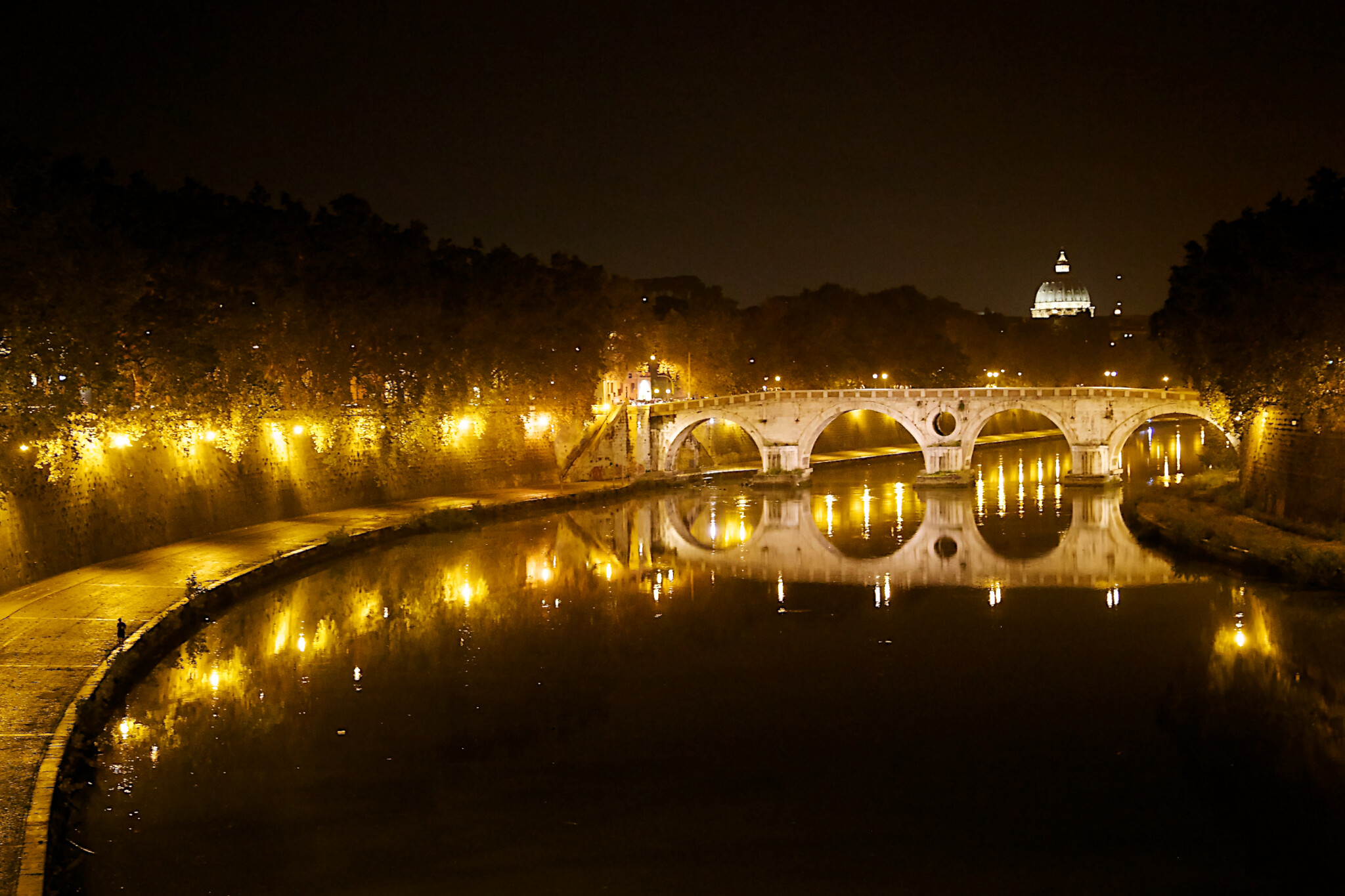 Le Tibre by night avec les reflets du pont Garibaldi devant le dôme de la basilique Saint-Pierre